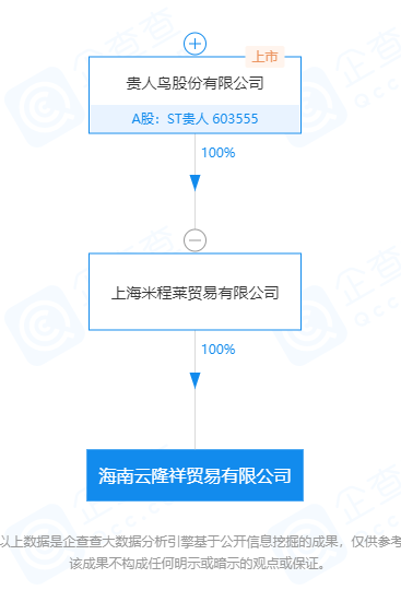 日前,海南云隆祥贸易有限公司(下称:云隆祥贸易)成立,股权穿透图显示,该公司由ST贵人(603555)全资子公司上海米程莱贸易有限公司(下称:米程莱贸易)全资控股。