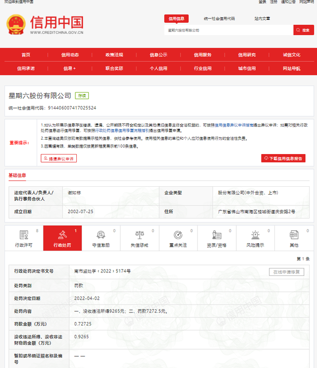 5月5日讯 ,据信用中国,日前星期六股份有限公司新增了一条行政处罚。
